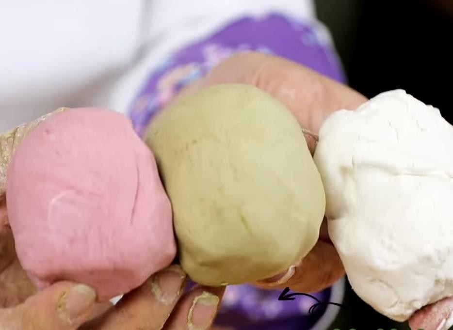 3、3色面团分别揉成小汤圆状,表面撒上糯米粉备用。