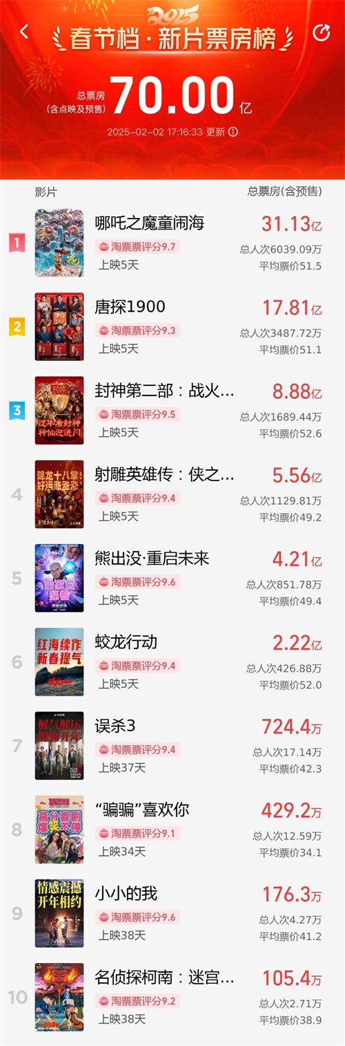 电影总票房(含预售)突破70亿!