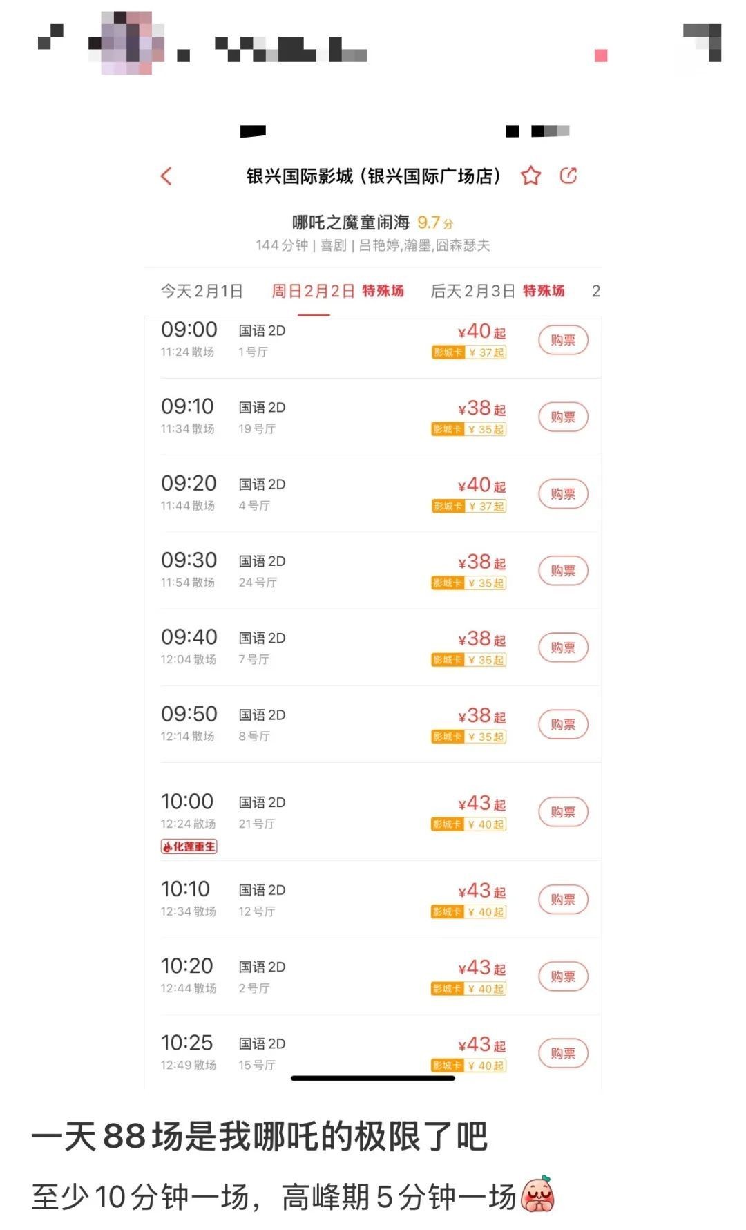 还有网友发帖表示,河南某影院一天排了88场《哪吒之魔童闹海》。网友称,平均10分钟排一场,高峰期5分钟排一场。记者查询发现该影院位于河南鹤壁。