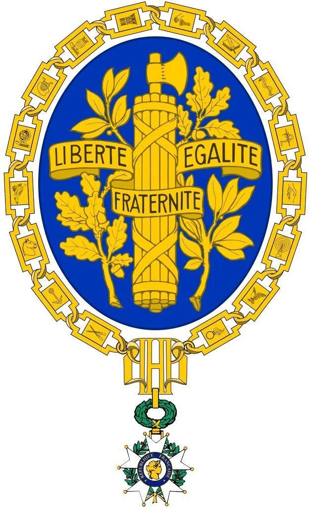 纹章主体是一个蓝色底色的椭圆形徽章,中间绘有古罗马时期象征权威的束棒(这也是法西斯的原型)。束棒被象征力量的橡树枝和象征和平的橄榄枝包围。其上的绶带写着法国大革命的口号“自由,平等,博爱”。