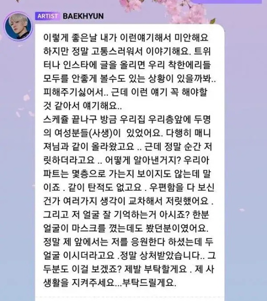 伯贤曾在粉丝现场说到“私生饭又给我打电话,真的很讨厌。很爱各位EXO-L,讨厌私生饭”。
