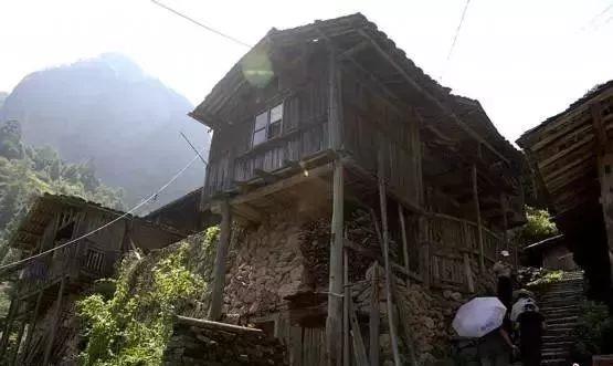 整个村寨贴崖而建,一面依山,一面悬空,悬空部分用二至五根直木撑起,人们需要抬头仰望,才能看到老虎际的村容村貌。