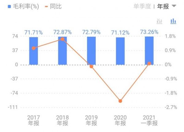 近几年今世缘的高价位产品占营收的比例不断提高,但毛利率却一直徘徊不前。今世缘白酒的毛利率在2020年、2019年、2018年、2017年分别为71.12%、72.79%、72.87%、71.71%。