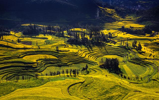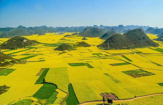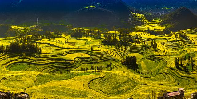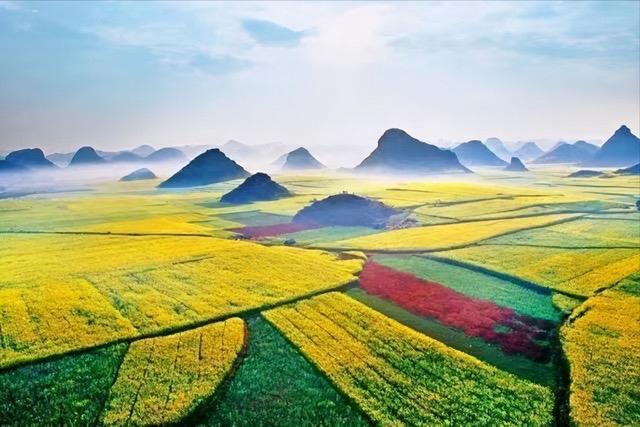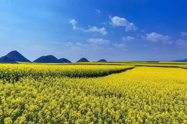 曲靖罗平油菜花在一片山中平原大地上展开,在平地上竖立着层峦叠嶂山峰,地形好似万峰林,被一望无际金色油菜花环绕,如今这里最惹眼的美景之一,当你驻足观景台向下俯瞰,金黄色的油菜花铺满山坡,云雾从山脚下涌起,随着风在山间飘荡,清晨的太阳跃出山巅,浓雾从山顶上慢慢往下退,露出金黄、明亮的油菜花田。把南国的春天映成一幅春色田园的画卷,当你在世界最大的自然天成的花海中,任谁都会感叹罗平是“金玉满堂”之乡。