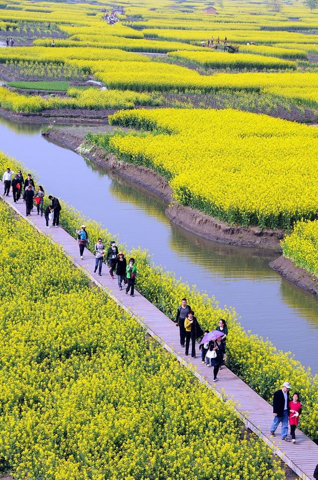 油菜花海除了水上坐船观赏外,也有栈道,观景台,兴化千垛油油菜花被称为全球三大花海之一,与法国普罗旺斯薰衣草庄园,荷兰的郁金香庄园并称全球三大最美花海。