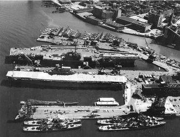 “企业”号的尽头:1958年6月22日,“企业”号(下)在布鲁克林船厂停泊,预备出售拆解。