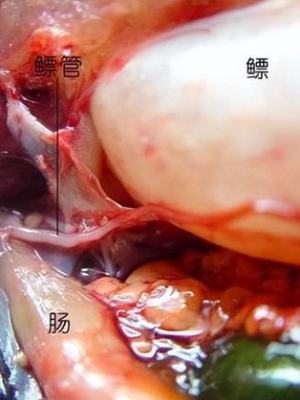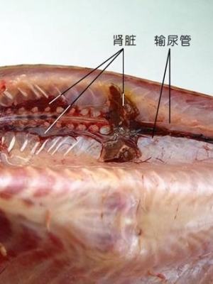 肾脏可分为前、中、后三部分。肾脏后部延伸出输尿管,左右输尿管在腹腔后部愈合,并突出一个不大的真的膀胱水里。总输尿管的末端与生殖输管相合,以一个尿殖孔开口或分开开口于肛门的后方。