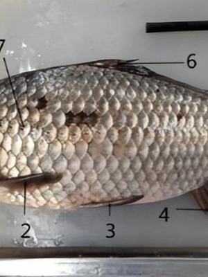 (1.鳃2.胸鳍3.腹鳍4.臀鳍5.尾鳍6.背鳍7.侧线)