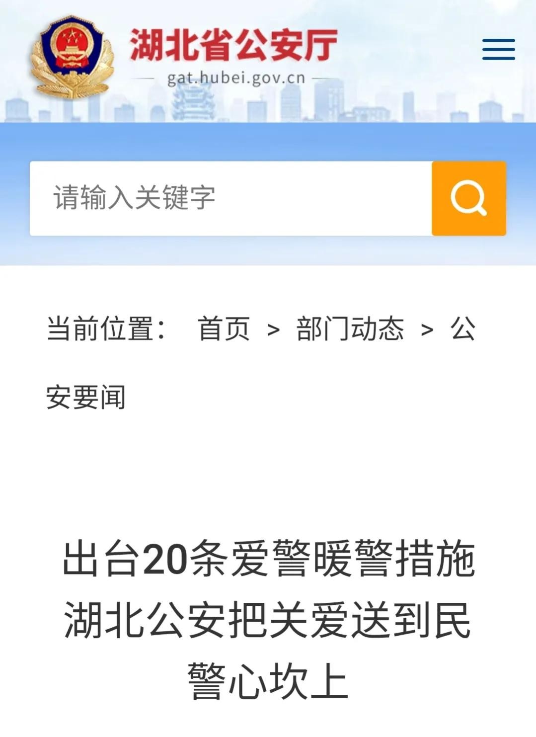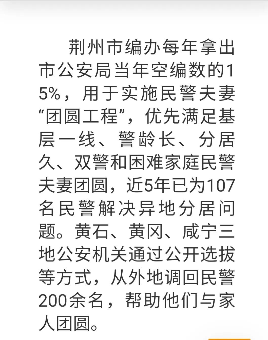 《出台20条爱警暖警措施 湖北公安把关爱送到民警心坎上》湖北省公安机关大力推进民警夫妻“团圆工程,逐步解决夫妻异地工作或与子女、父母异地生活等困难。荆州市编办每年拿出市公安局当年空编15%,用于实施民警夫妻“团圆工程。