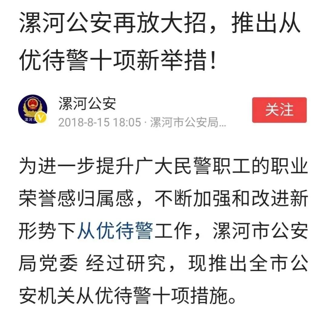 漯河公安再放大招,《推出从优待警十条措施》之一:完善民警职工职业保障机制,积极争取人社、财政部门支持,尽快落实调整后的值勤岗位津贴和法定工作日之外加班补贴政策。强化职业风险保障,为民警职工购买重大疾病和人身意外伤害保险,畅通民警职工工伤紧急救治“绿色通道”。