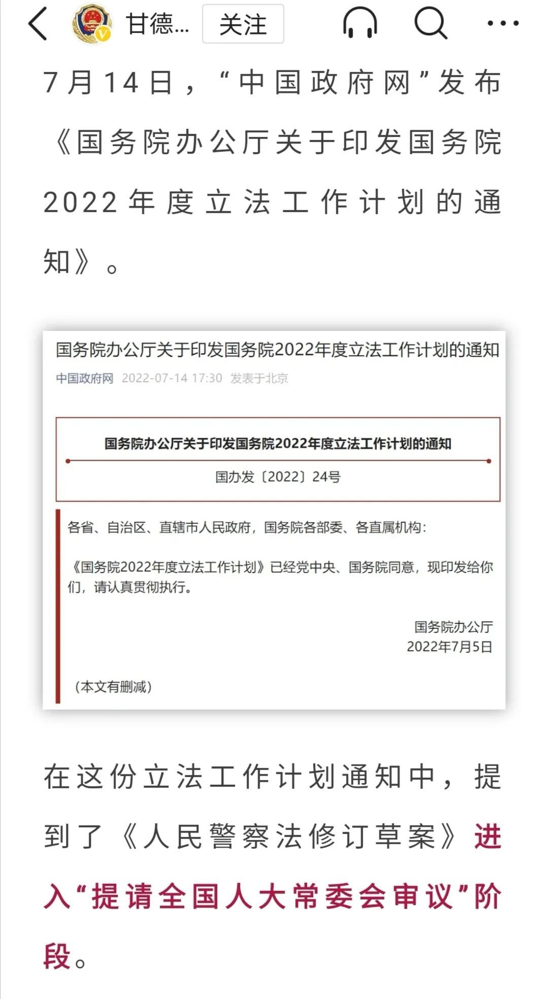中国政府网发布〈国务院办公厅关于印发国务院2022年度立法工作计划的通知〉,这份立法工作计划通知中,提到了《人民警察法修订草案》进入“提请全国人大从未审议阶段。