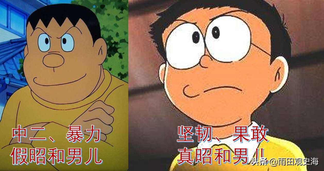 正如《哆啦A梦》能代表日本文化一样,整部动画片确实是日本二战后昭和时代的一个缩影。就剧中的人设而言,大家喜欢大雄而非胖虎,正是后昭和时代人们的一种价值取向。崇尚暴力,喜欢揍人的胖虎,就是“很有精神”精力旺盛的旧日本昭和男儿,而务实、阳光的大雄则是新时代的“昭和男儿”的代表。