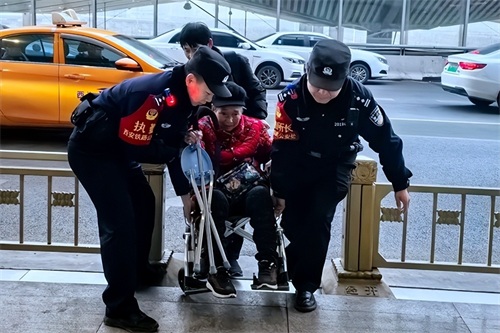 1月26日,西安铁路公安局西安公安处民警护送坐车老人安全出行。