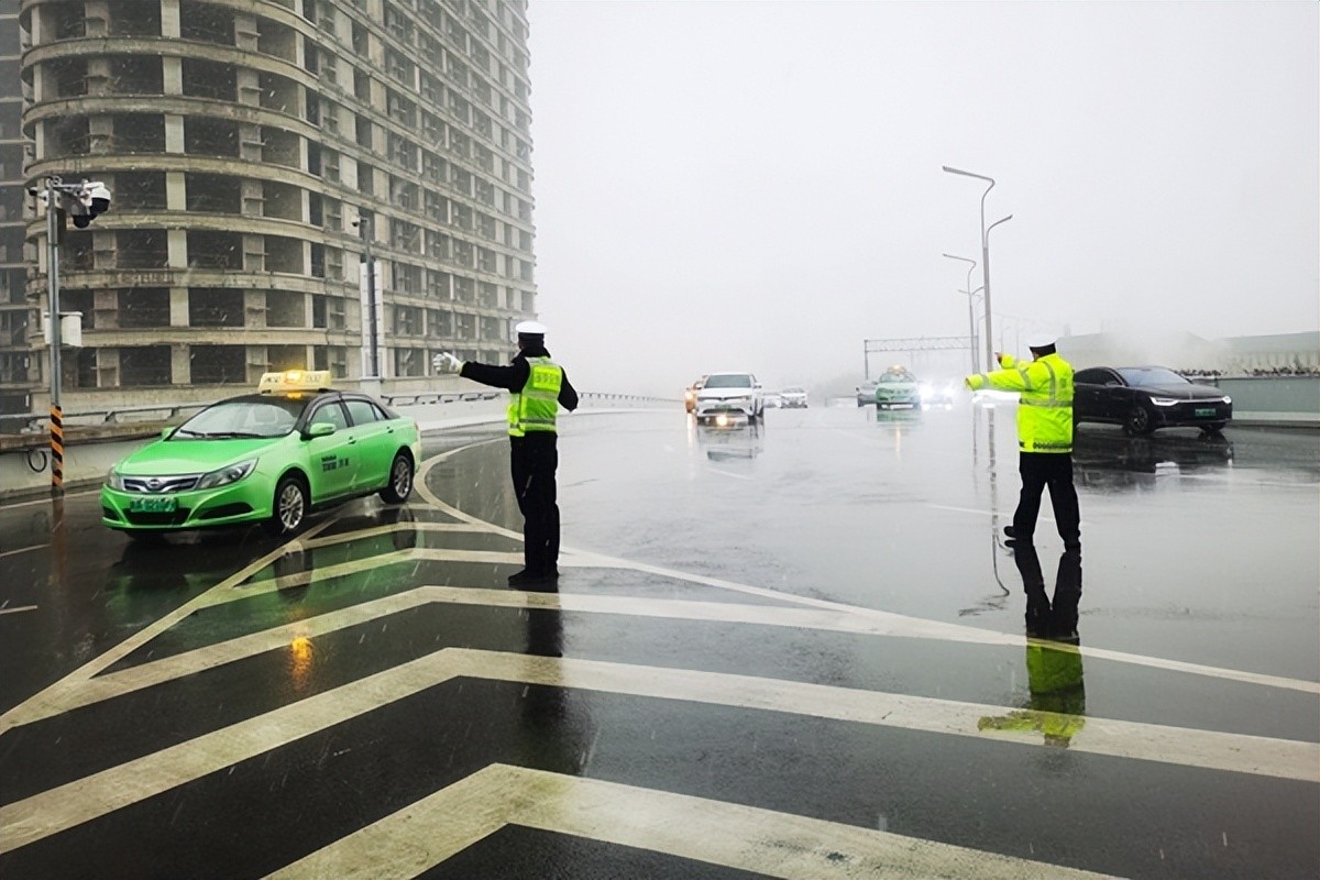 1月25日,西安铁路公安局西安公安处交警风雪中指挥交通。