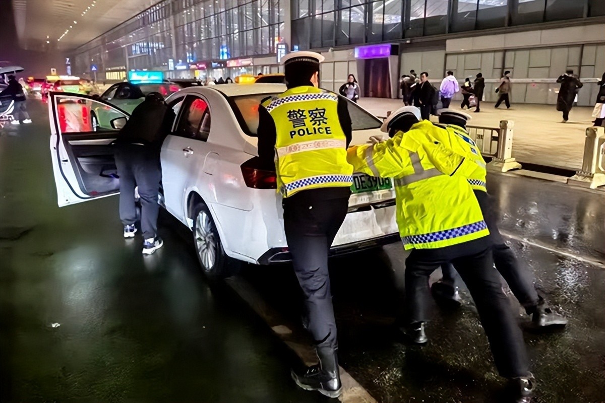 1月26日,西安铁路公安局西安公安处交警帮助抛锚车主推车。