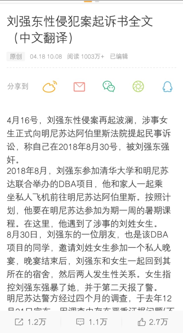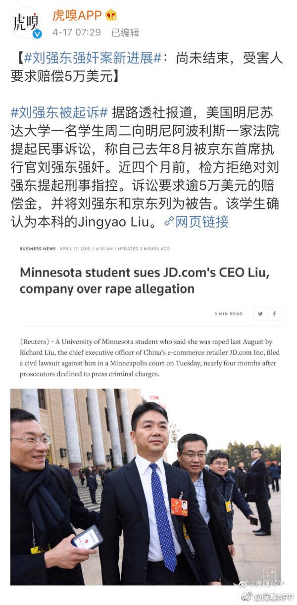 4月16日,京东CEO刘强东性侵案女主刘静尧(音译)正式向法院提起诉讼,诉状曝光了原告姓名,并提供了更多细节。