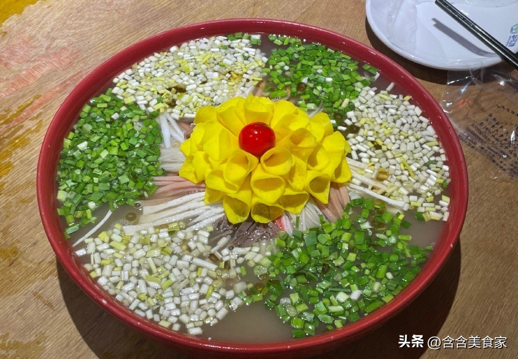 牡丹燕菜是河南洛阳的特色名菜,选用白萝卜、鸡肉等食材上笼蒸透,摆成牡丹花的造型,颜值爆表,酸辣香郁,爽滑适口,正宗的牡丹燕菜是酸辣口味的,它的辣是胡椒的辣,不是辣椒的那种辣,它是一道酸辣爽口,解腻开胃的汤菜,本地人大部分都很喜欢,很多外地游客也赞不绝口。