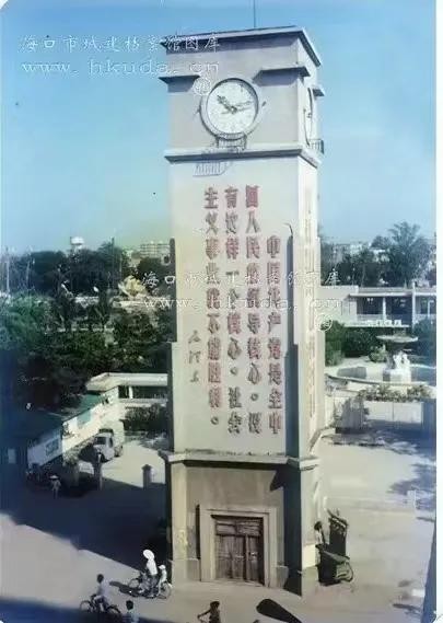 1948年的9.27台风,钟楼遭受重创,楼顶的部分箭形尖角被风刮毁,在而后的数年中,钟楼历经沧桑,破损严重。1967年,海口市政府修建钟楼,将楼顶的尖角铲平,外墙粉刷成灰白色,并嵌上了有时代印记的标语。