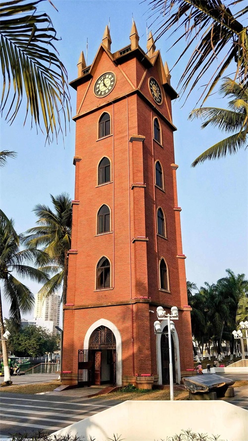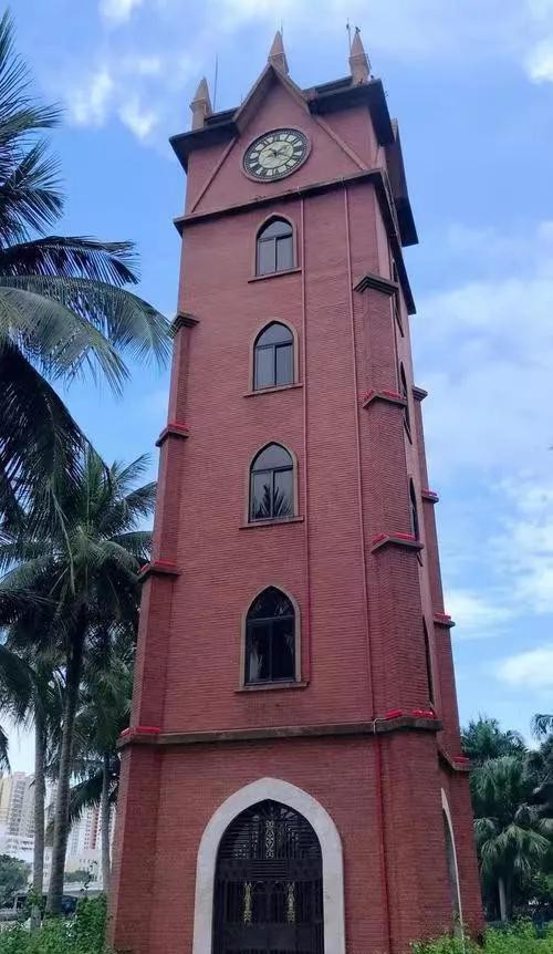 钟楼于1929年建成使用,红砖墙身,楼高5层,顶端有8支箭形的尖角。大钟是在德国订制的,安装在顶楼,每半小时报时一次。据说,当年钟楼的钟声悠扬动听,方圆一里的海口市民都能听到。