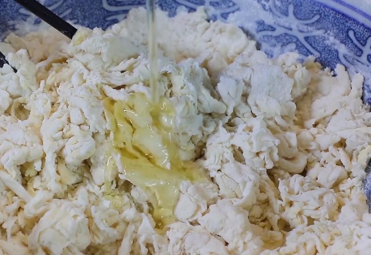 2,用筷子把鸡蛋打散搅拌混合均匀,再用270毫升温水和面,边加边搅拌,搅拌成面絮后淋入20毫升食用油,下手揉成一个光滑的面团。
