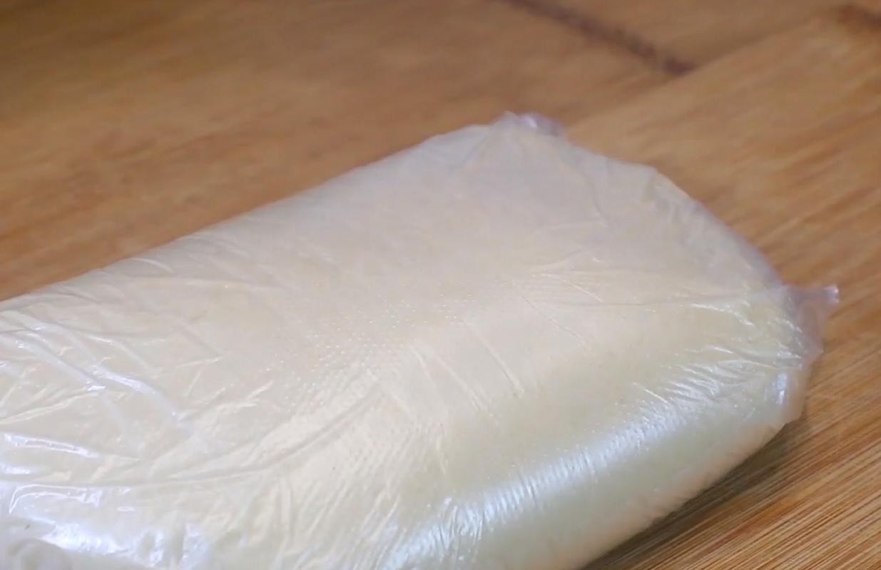 3,揉好的面团放到面板上,用折叠的方式继续揉面,把面团揉光滑,裹上保鲜膜放入冰箱冷藏发酵一个晚上。