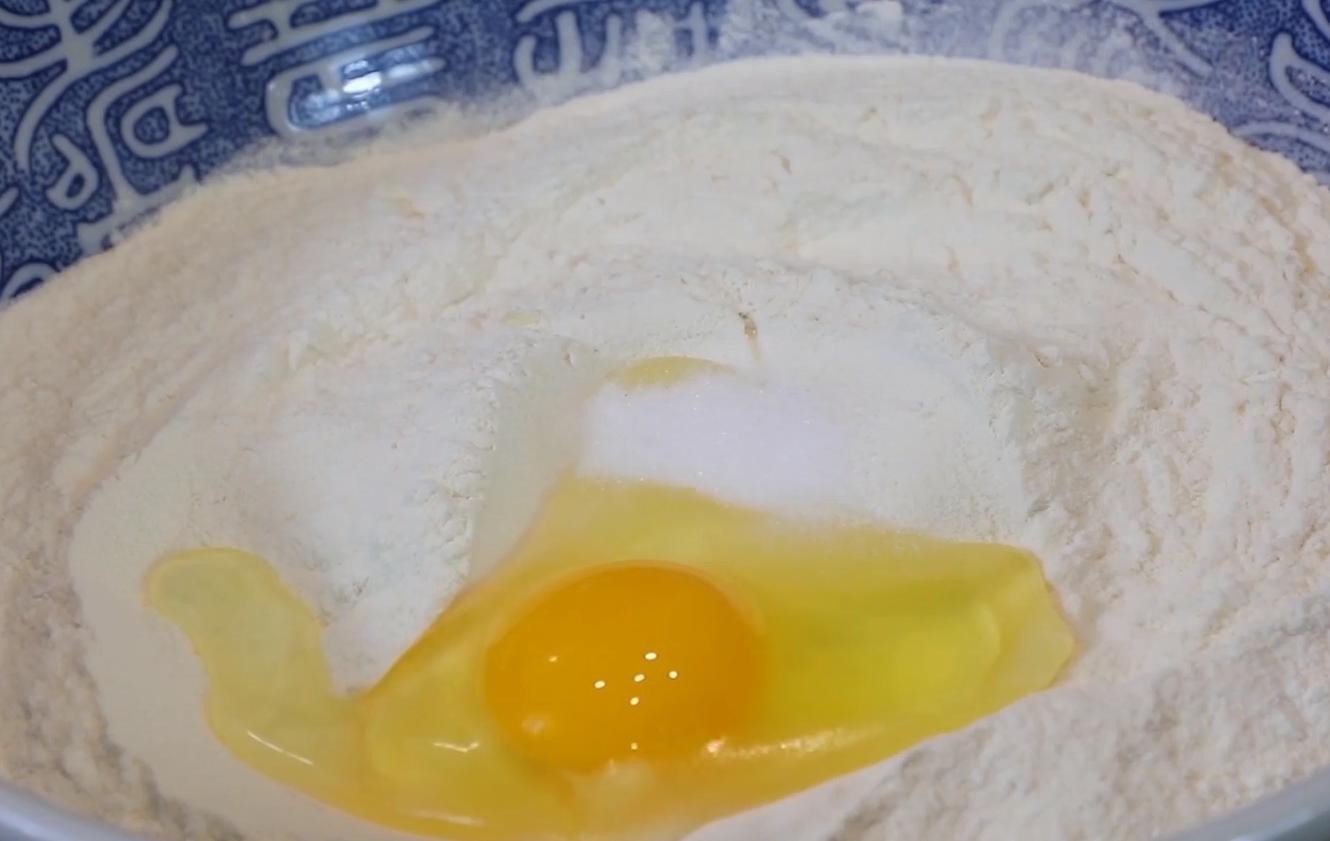 1,盆中加入500克的面粉,打入一个鸡蛋增加蓬松度,5克食用盐,5克泡打粉,5克小苏打,一勺白糖促进发酵。