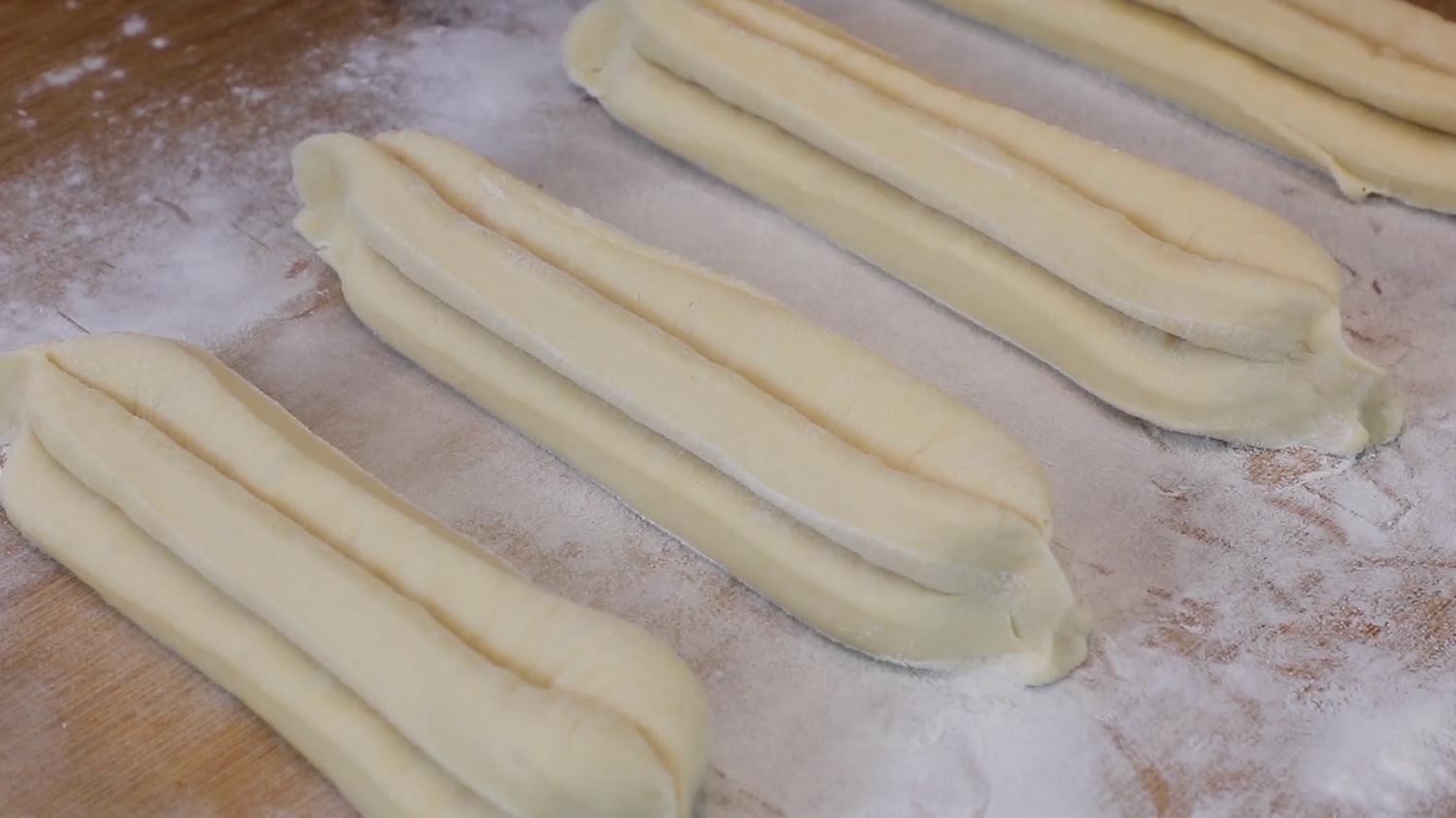 5,把每一个长条面剂从中间按压一下,再把两个面剂落在一起,落好之后用筷子再按压一下,把两头捏紧,一个完美的油条生坯就做好了。