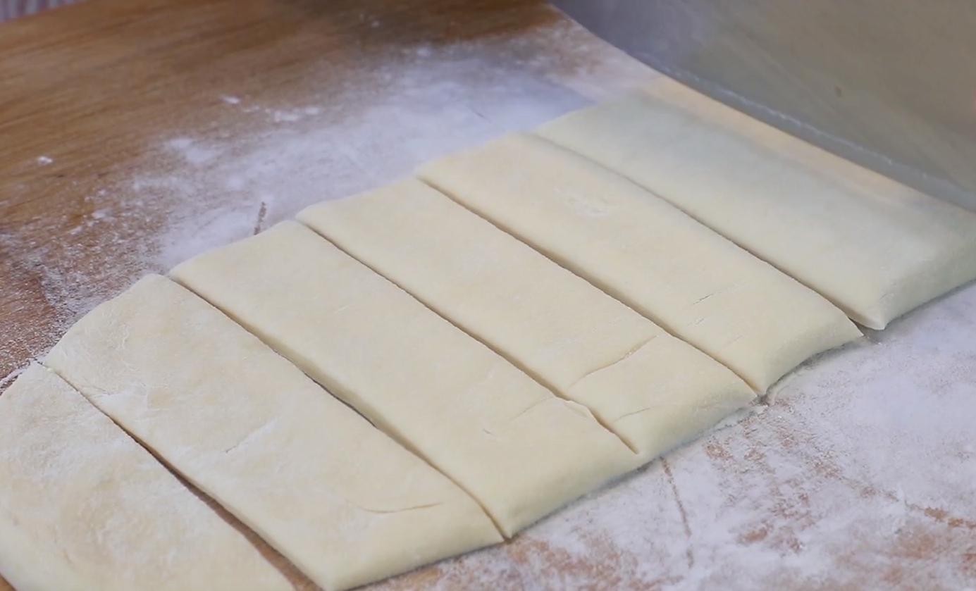 4,第二天早上起来,把面团取出不需要揉面,直接按扁用擀面杖擀薄,用刀切成宽3厘米左右的长条。