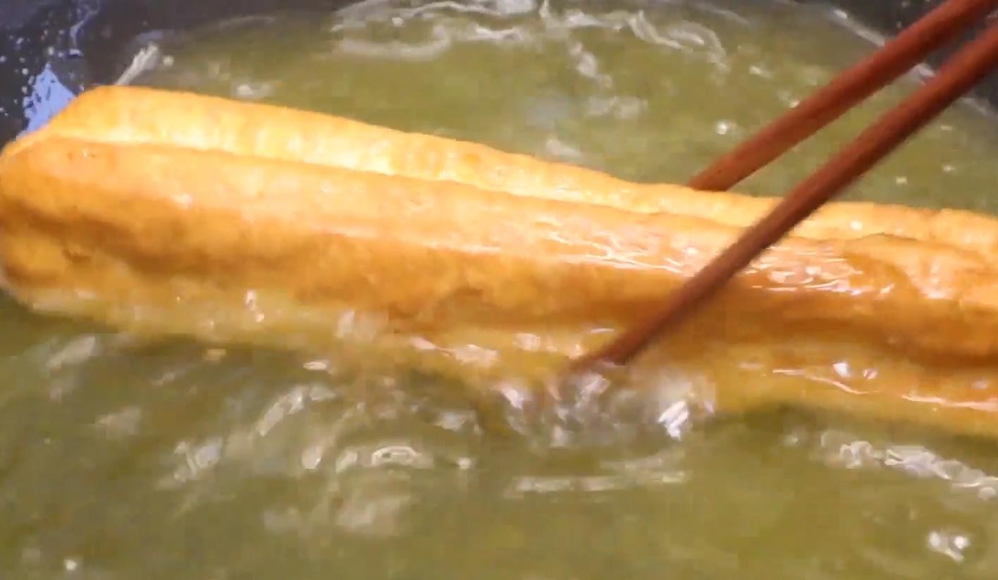 6,锅中倒入食用油,油温烧到下入筷子冒小泡泡,下入做好的油条生坯,大约10秒钟左右油条会飘起,用筷子翻动使油条受热均匀。
