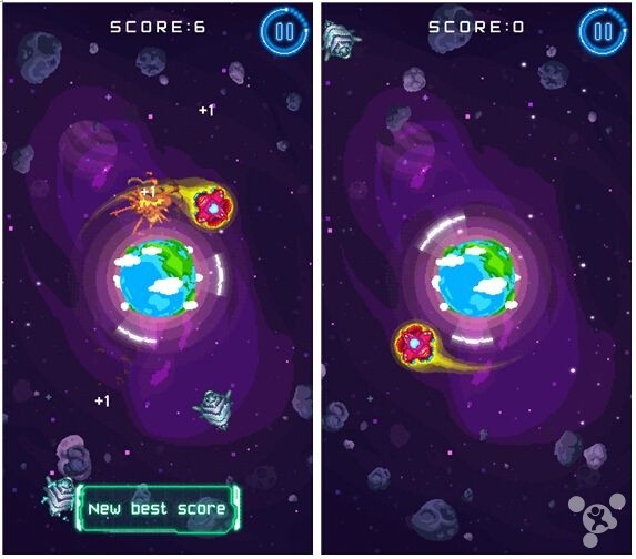 这里没有关卡一说,我们的目的就是要永无止尽地将试图毁灭地球的敌人给及时清除,可以看到我们的英雄在画面中央的地球周围做圆周运动,而敌人会从四面八方涌来,尽管地球周围有三个防护板,但是面对越来越多的敌人,这些挡板起不了多大的保护作用,何况它们会被敌人冲撞消失。