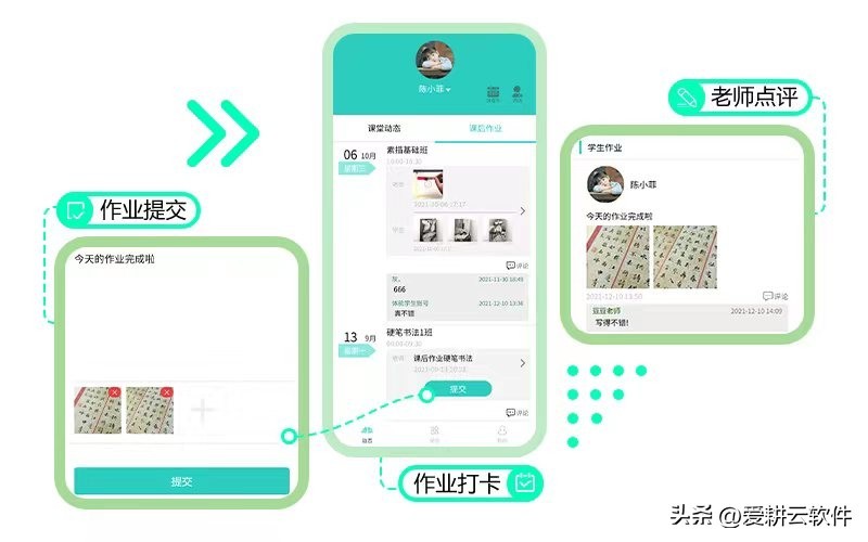 爱耕云是一款专门针对教培机构开发的管理系统,拥有13年软件行业开发经验,功能涵盖教培机构“品牌传播、招生营销、排课管理、学员考勤、教务管理、数据分析、家校互动、多校区管理”等核心环节,减轻教培机构教务管理时间,全面提升家校服务效率。专门为机构打造自己品牌的小程序,家长和老师不用下载APP,微信即可操作。专属小程序家长端,自动推送上课提醒、考勤通知、调课、放假等通知,家长在线查询孩子上课视频、图片等动态,一键转发分享,提升转介绍,购买课时剩余、上课记录,清晰可见!