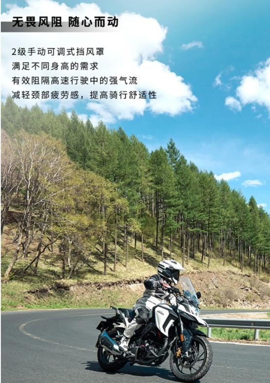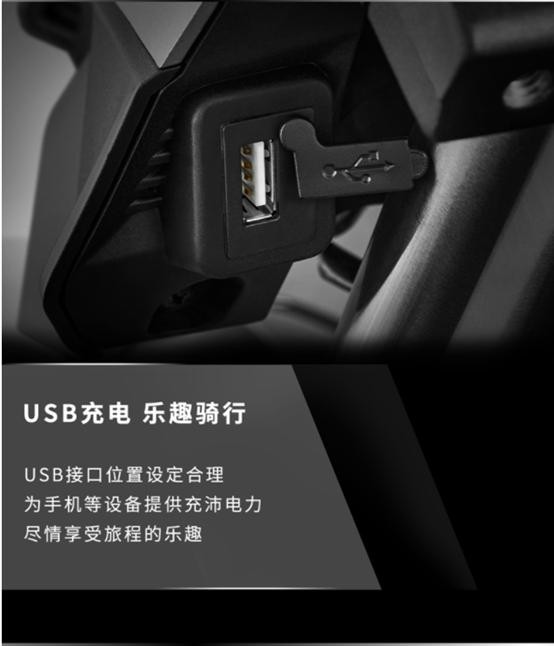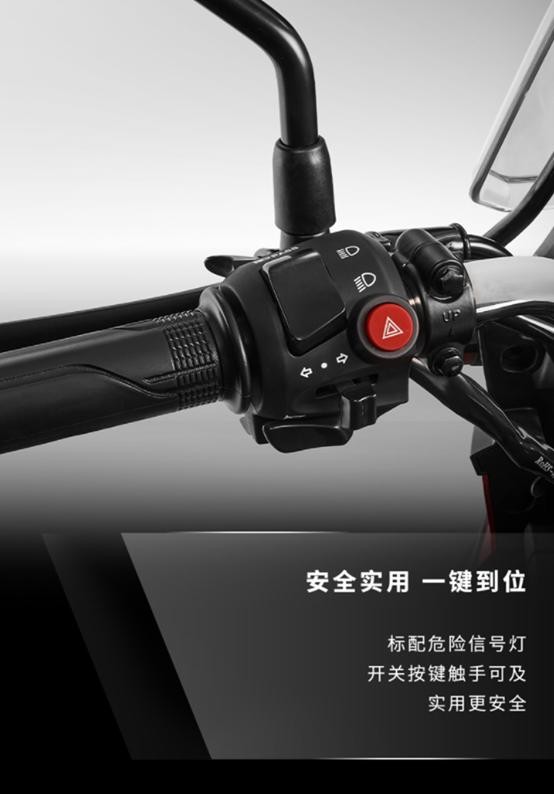 配置:液晶显示屏、国际5档、双拉线油门、标配USB充电口、标配风挡不可调节、带铝合金三箱,带护扛、挡位显示、LED灯、标配危险警示灯(双闪)、单前通道ABS防抱死系统、前后碟刹盘式制动。