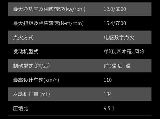 性能:搭载Honda引擎震动小、油耗低、噪音小的特点, 品质稳定,极速110km/h、油耗2.8L/100km、续航可达450+km。