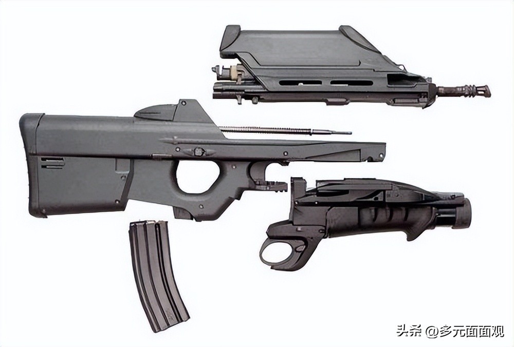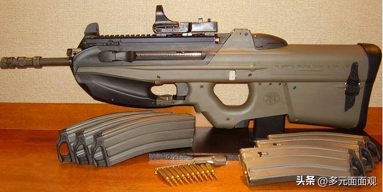 FN2000突击步枪是一种采用独特的模块化设计的步枪系统。是一款紧凑型5.56毫米无托步枪。该枪口径5.56毫米,长694毫米,枪管长400毫米,理论射速为850发/ 分。自动方式为导气式,采用枪机回转式闭锁。带空弹匣重3.5千克。可下挂40毫米榴弹发射器,该发射器重1千克。瞄具为1.6倍的光学瞄具,即使是在阴暗的天气里,目标影像也很清晰。拉击柄设在机匣的左边。