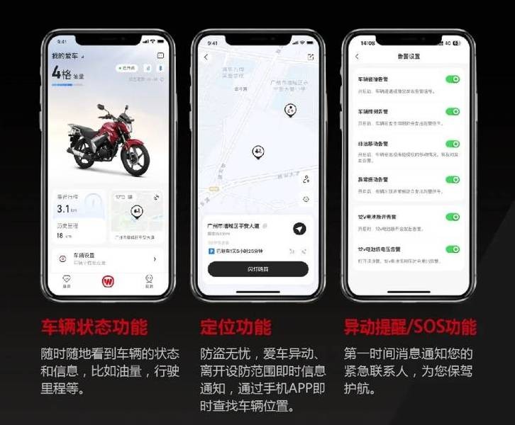 全系标配智能Wi-Box系统,通过手机APP可以查看车辆状态、车辆定位、异动提醒、SOS等功能,提升骑行便利性。