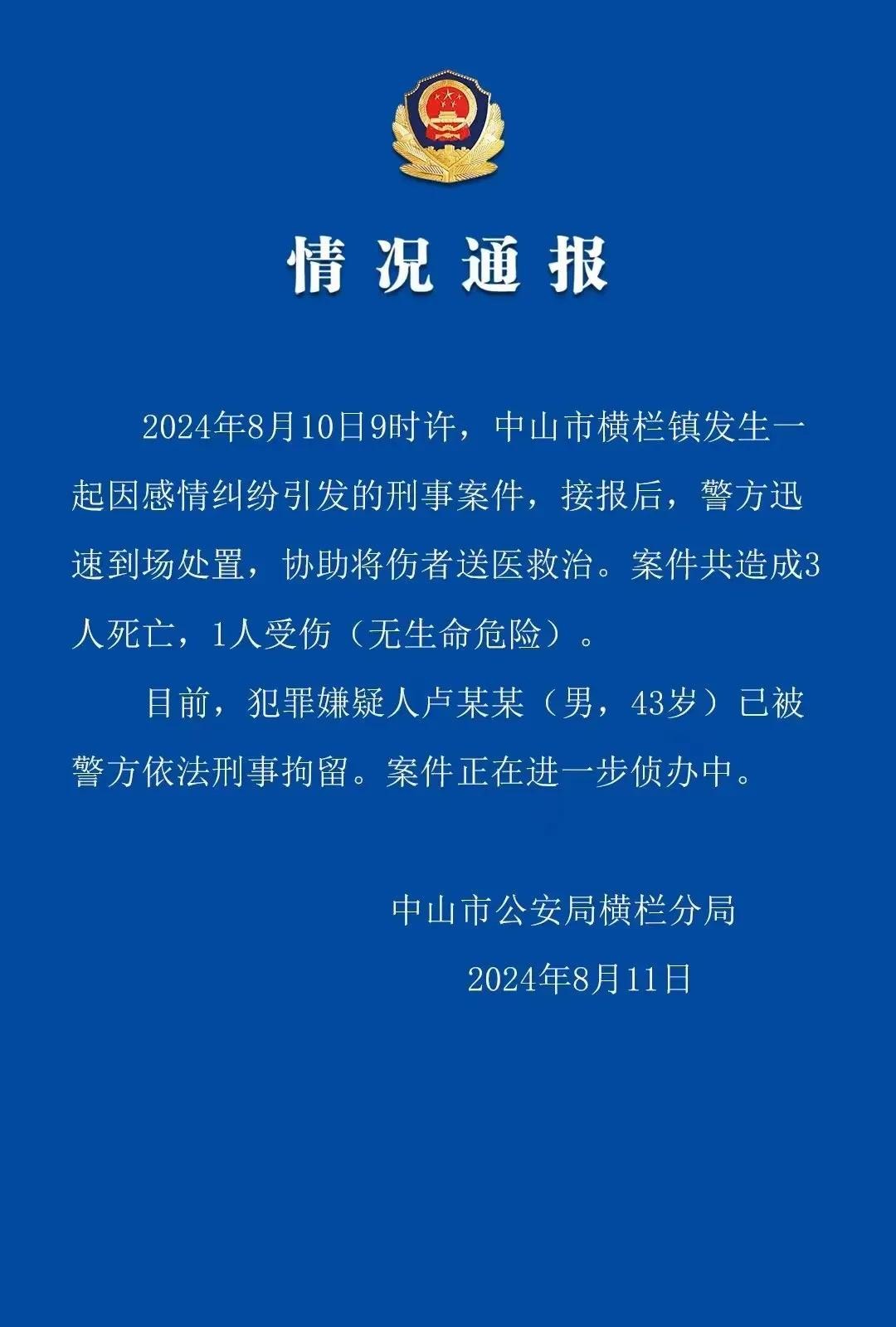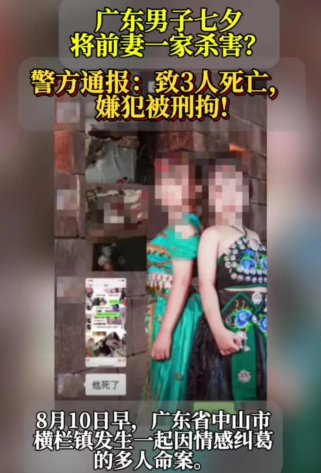 广东中山发生感情纠纷命案,警方:致3死1伤,嫌疑人透露现场照片