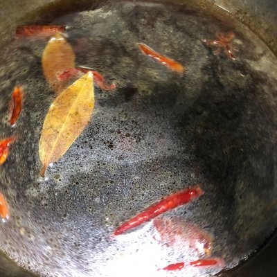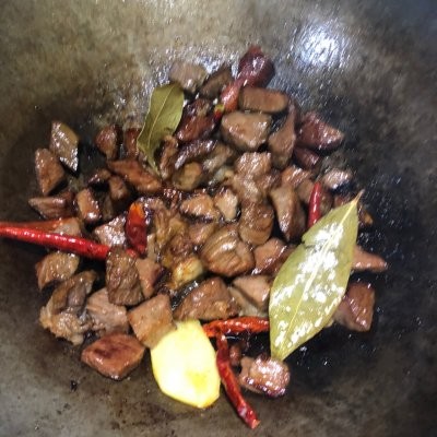 5、加入八角、桂皮,香叶、干辣椒炒匀