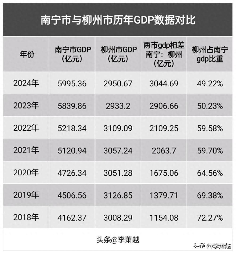 从2018年至2024年,南宁市GDP从4162.37亿元跃升至近6000亿元,增量约1833亿。而柳州市的GDP从2018年的3008.29亿降至2024年的2950.67亿元,增量减少约58亿。柳州与南宁的差距也从2018年的1154亿扩大到2024年的3044亿。GDP比重从2018年柳州市占南宁市72.27%降至2024年的49.22%,相当于柳州市的GDP不足南宁市的一半。