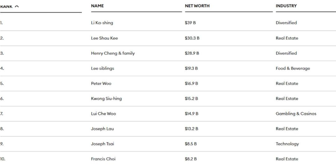 第三至第五位的分别为新世界的郑家纯家族、李锦记第三代掌舵人李文达及九仓顾问吴光正,上年排第六的华人置业创办人刘銮雄跌至第八位。