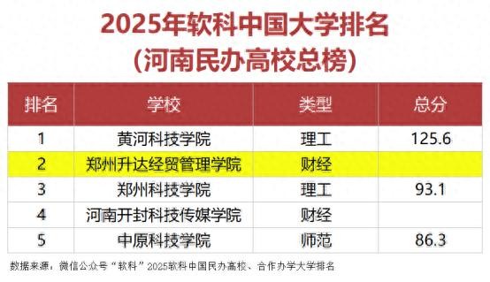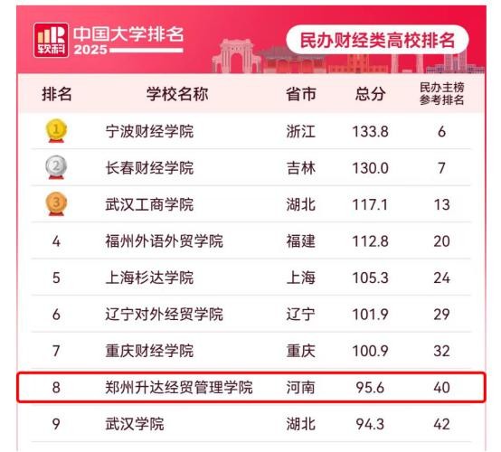 郑州升达经贸管理学院荣登2025年软科中国大学排名河南省民办高校总榜第二名、