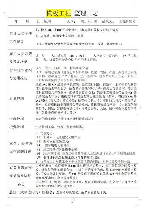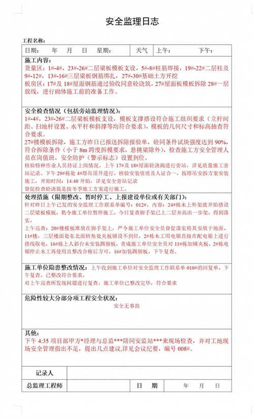 监理日志范本中还包含了“进度监理”内容,对施工进度进行实时跟踪,对比计划进度与实际进度,分析滞后原因,并提出加快施工进度的合理建议。在这套监理日志范本中,对施工现场的每一项工程质量进行细致检查,记录并提出整改意见,有了它事半功倍