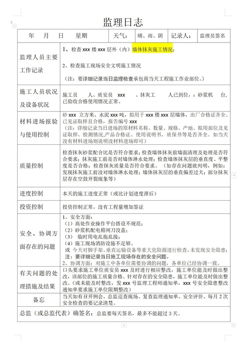 15套监理日志范本内容全面,包含了房建、钢筋、模板、墙体抹灰、桥梁、土方、装饰装修等等,都是常用的日志模板,需要哪个直接套用,word格式,可以修改,照这个修改,每天的监理日志都不重样,人人夸你有水平,把记录日期、天气状况及施工部位等基本信息写的一清二楚,以及监理人员当天的施工内容、人员配置、机械使用情况以及材料进场与检验情况等等,列举清晰