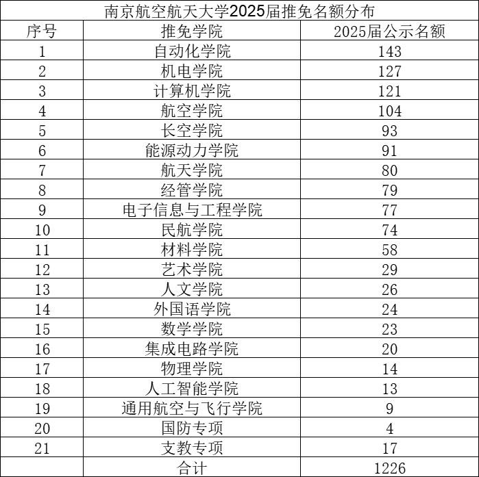 根据南京航空航天大学发布的2025届推荐免试公示名单,推免名额为1226人,比2024届公示名额(1123人)增加了103人,其中包括国防专项4人、支教专项17人。