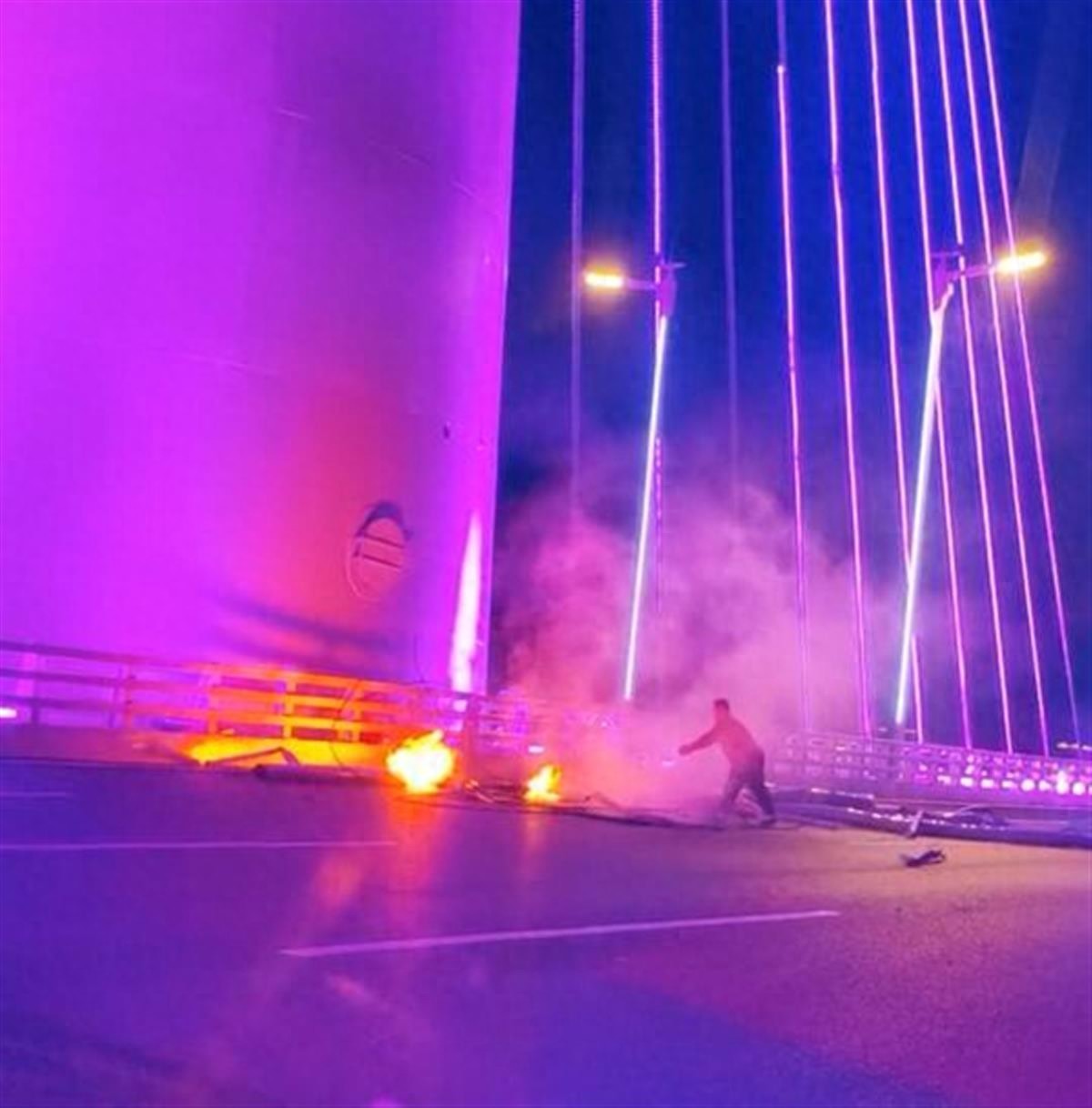 11月6日,一名现场目击者告诉极目新闻记者,当时他恰好经过桥上,还拿出车上的灭火器前去扑灭火灾,但他无法确定脱落的是大桥上的灯带电缆还是大桥的斜拉索。