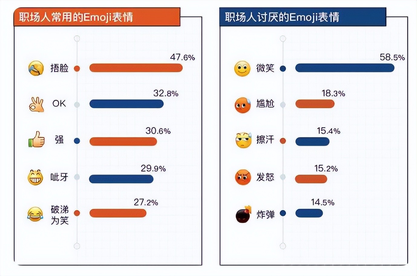 在职场中,表情的使用率也非常高,据投票统计在职场中大家最讨厌的是【微笑】,最喜欢的是【捂脸笑】。