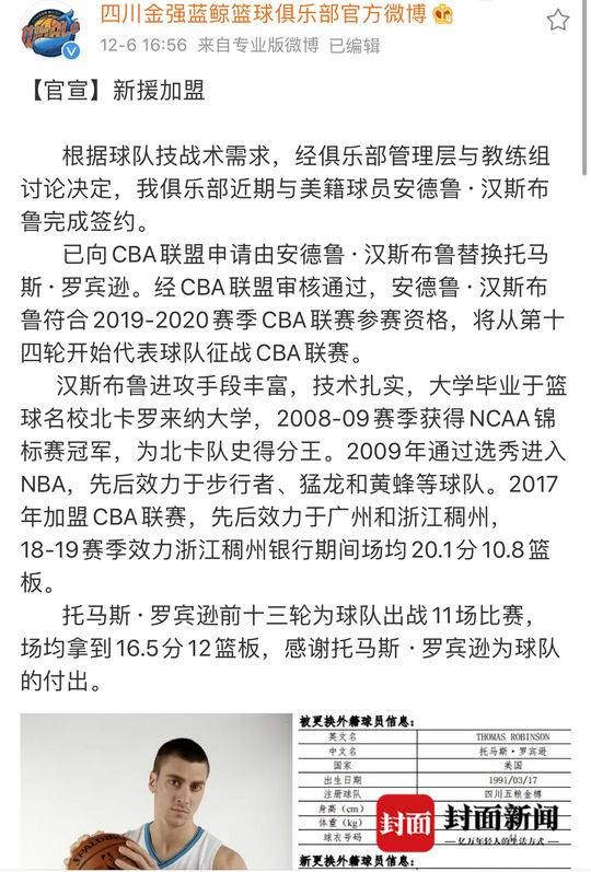 12月6日下午,四川金强男篮俱乐部官方宣布,根据球队技战术需求,近期与美籍球员安德鲁·汉斯布鲁完成签约,替换大外援托马斯·罗宾逊。据了解,汉斯布鲁将代表四川队在CBA常规赛第十四轮亮相。