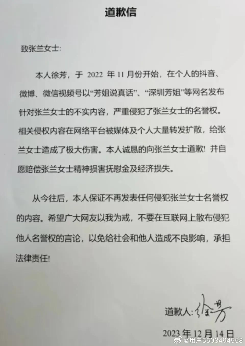 侠女徐芳今天在对张兰道歉了,法院判决已出,徐芳赔偿张兰数万元,因其发布的视频侵害了张兰的名誉权。记得徐芳的视频点击量颇高,甚至影响力到了海外,或许她的本意是伸张正义的同时博取知名度直播带货,本是行侠仗义,奈何与金钱扯上关系,这份善良便不纯粹。最大的错误应该是为了应付黑大S的水军而组建微信群吧,身为组织者肯定要接受法律制约。对于大S的这场史无前例的网暴至今没有走向尾声,有很多热衷于发布不实信息的人将一些张兰汪小菲的旧闻当做新发生的事一而再再而三的轮番刷屏,所谓谎话说1000遍就是真理,在不求实证只图热度的自媒体时代效果格外的好。为大S惋惜,希望有一天她能开一场直播,为自己说几句话。她是一个伟大的母亲,一个被别人污蔑到体无完肤都不曾恶语相向的有口德的人,一个所有苦难自己吞下只为孩子平安长大的妈妈,一个被软饭王吃干抹净还泼一身脏水却用自己弱小的身躯抗下一切的人。祝你早日恢复名誉!身体恢复健康!余生皆是幸福!