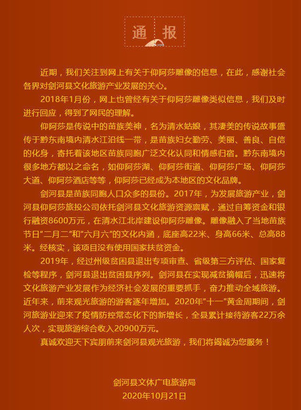 近日,有网友拍摄贵州剑河县88米世界最大仰阿莎雕塑引起争议。据了解该雕塑为剑河县2016年11月开工建设,2017年7月建成,共耗资8600多万元。而剑河县曾为国家级贫困县,2020年3月3日才脱贫。10月21日,剑河县文体广电旅游局微信公众号发布情况说明称,该雕像通过自筹资金和银行融资8600万元,没有使用国家扶贫资金。