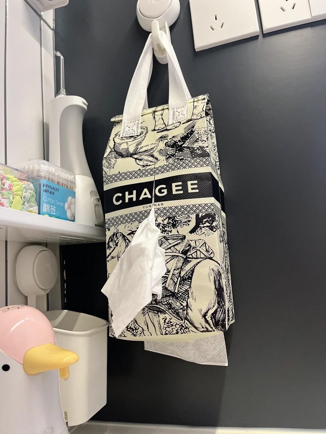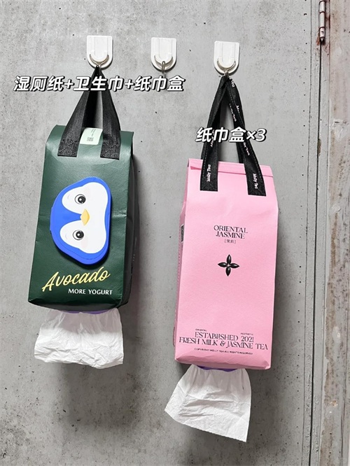 除了装东西之外,还可以把它粘贴在墙上,奶茶袋子底下划一个口子,将纸巾放入奶茶袋子里面,从底下就可以抽拉纸巾了。
