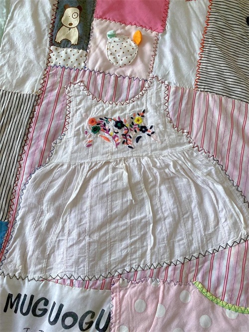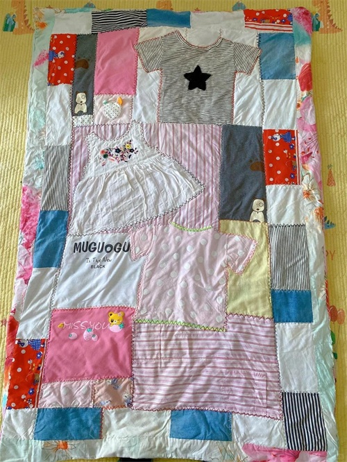 把小孩不穿的衣服,缝缝补补就可以做成一个小被子了。
